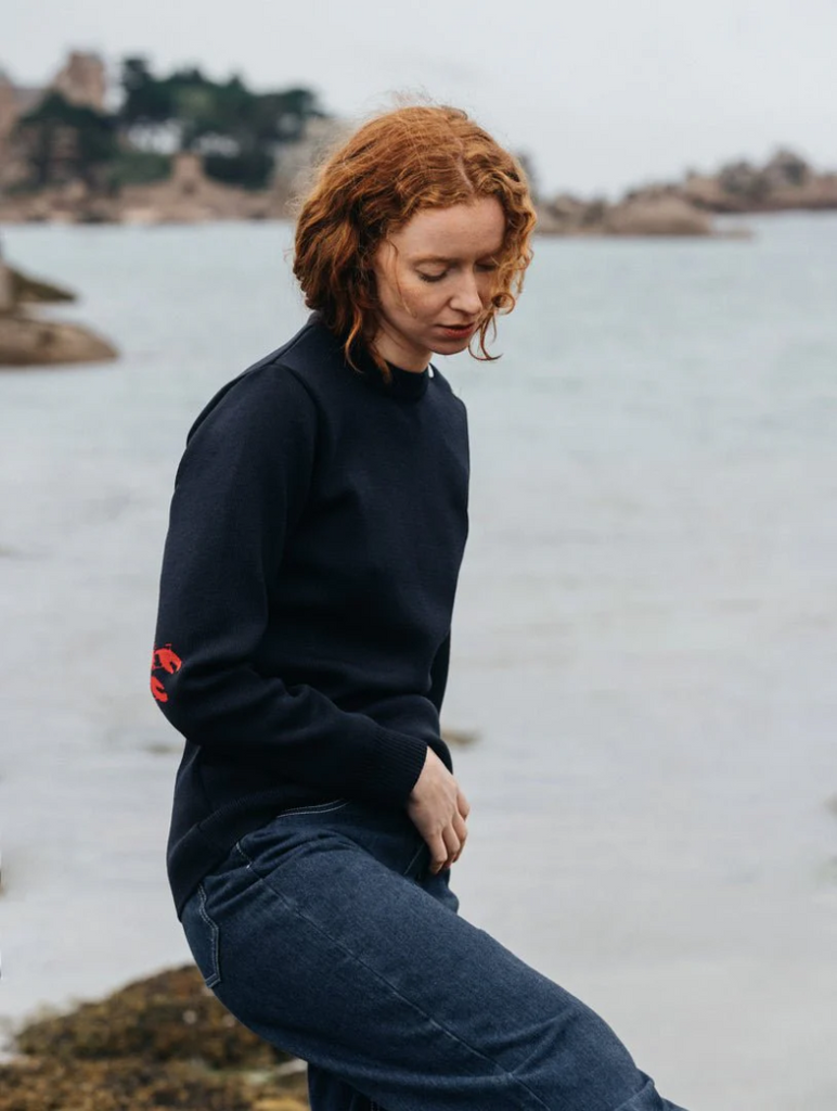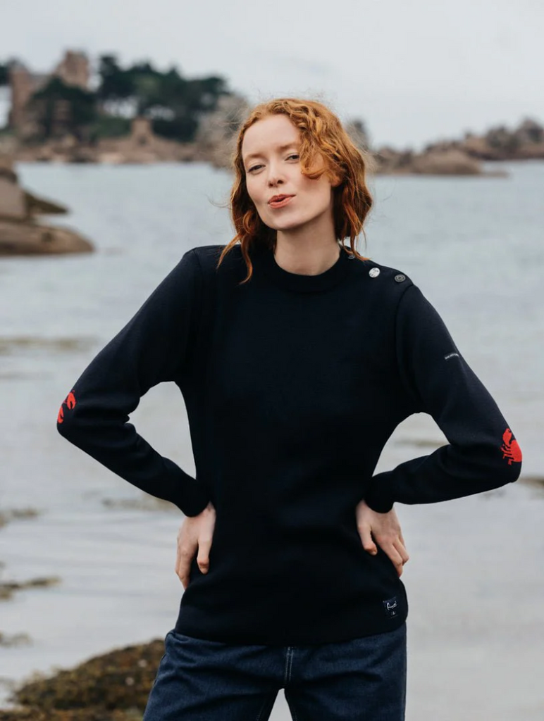 Le Pull marin Femme “Homard & Crabe” de Baie des Caps & Augustin revisite le pull classique bleu marine avec une touche originale et pleine de caractère : ses coudières brodées de motifs homard & crabe, inspirés de l’univers maritime et des accessoires Augustin.
