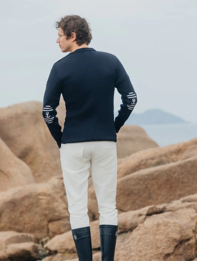 Le Pull marin homme “Ancre Rayée” de Baie des Caps & Augustin revisite le classique pull marin bleu profond avec une touche d’originalité : ses coudières affichent un motif d’ancre rayée emblématique. Tricoté en 100 % laine vierge, ce pull conjugue chaleur naturelle, durabilité et style intemporel, fidèle aux traditions maritimes bretonnes.